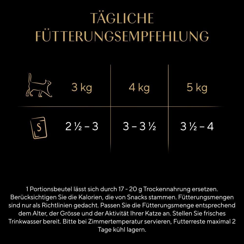 Complete daily nutrition: Suitable as a complete food. For a 4 kg adult cat, the recommended feeding amount is 2 pouches per day plus 15 g of dry food. Fresh drinking water should always be available.