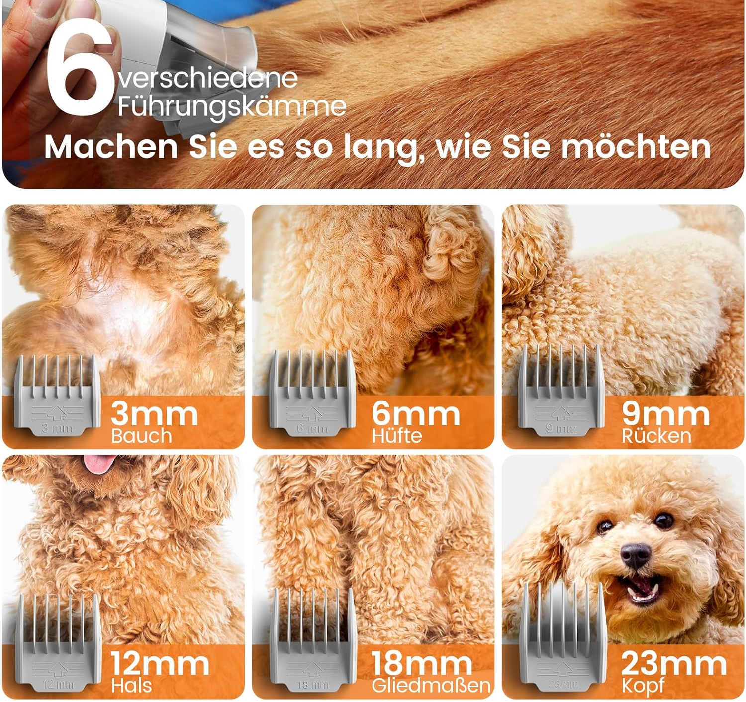 6 × guide combs (3 mm / 6 mm / 9 mm / 12 mm / 18 mm / 23 mm)